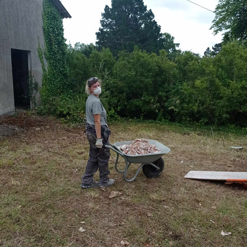 Nous avons retiré du doublage en brique dans le hall et la chambre PMR, fait tombé trois pans de murs, décâblé tout l'étage et roulé les câbles, déblayé les gravats, débroussaillé autour de la longère et même fait tombé un arbre qui menaçait la bâtisse. 💪🏻💪🏻💪🏻
