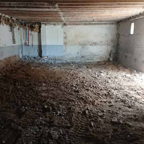 Nous avons poursuivi la démolition de l'ancienne étable au rez-de-chaussée et avons découvert plusieurs dalles successives et extrait des tonnes de gravats qui servent à l'empierrement du parking.